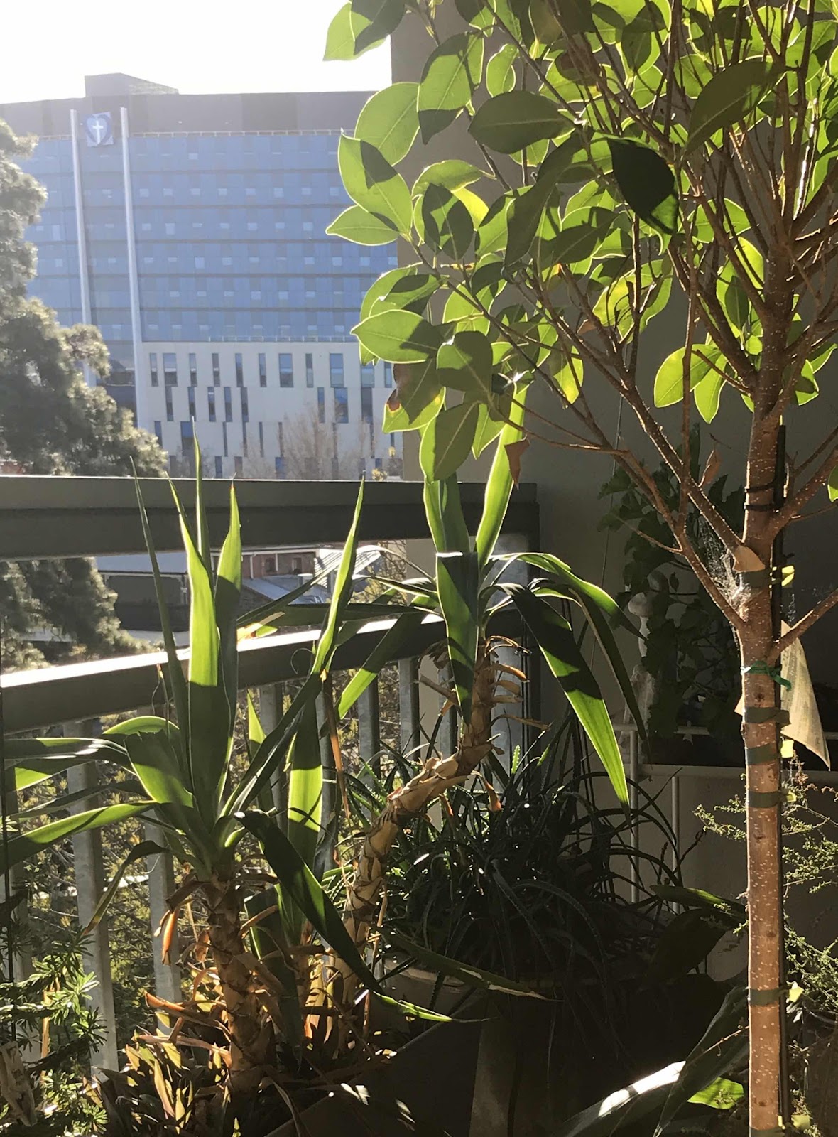 The side of the aeonium facing the wall is now flat. I'm not clear if this is due to the Noisy Myna or from being away from the sun and weather. It is, however, flatter than it was when I first photographed it.