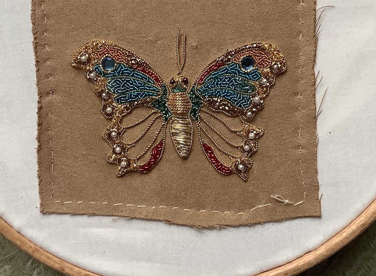 The butterfly is about 3 inches across and being worked on ultra suede ready to be cut out when finished and mounted in a 3 D way - so getting there with the chipping now with all the pp edging work complete