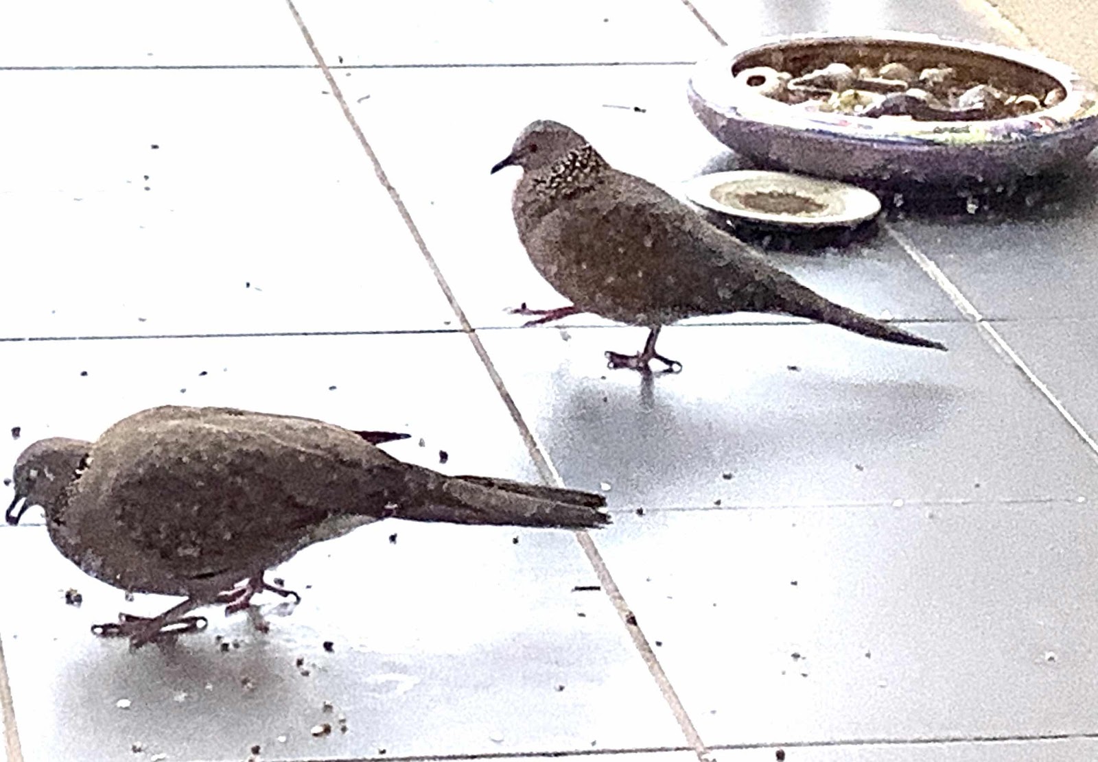 The doves had come and gone. There was a little bit of seed left from yesterday's late distribution but I added a bit more when they arrived. Myrtle flies away as soon as I open the door, however slowly, but Turtle stays.